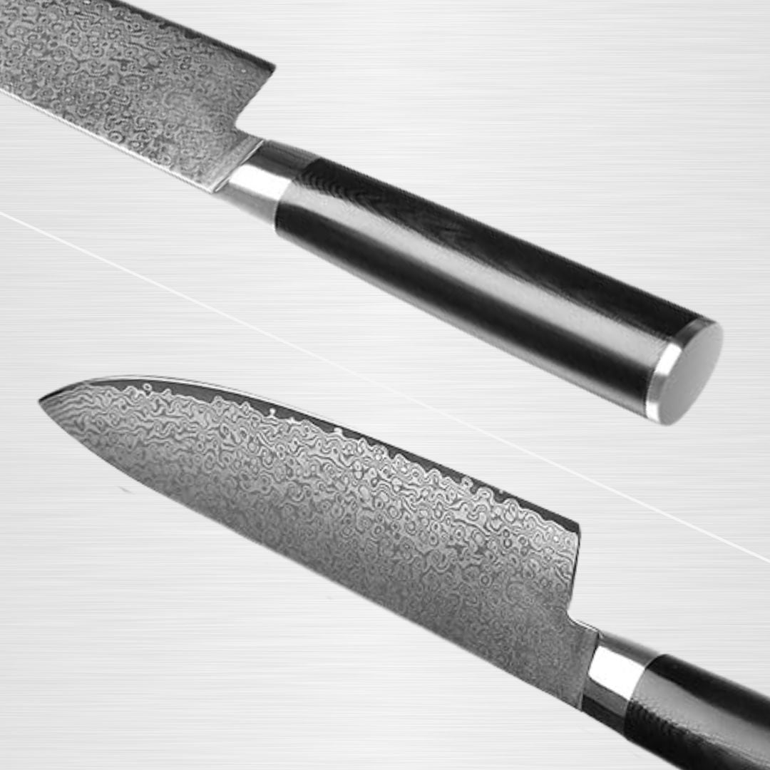 Coltello Santoku: Il coltello Santoku è anche un coltello versatile, ideale per affettare, tritare e tagliare vari alimenti. Con una lama larga e dritta, e una punta arrotondata, offre una grande superficie di taglio. In sintesi, è perfetto per realizzare molteplici preparazioni in cucina.